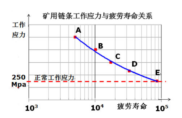 疲勞斷裂失效是礦用鏈條常見的一種失效形式,煤礦井下輸送機工作時,鏈條處于運動狀態,承受的是動載載荷,屬于動態疲勞范疇,因此鏈條的使用壽命(疲勞壽命)與其工作時所受的載荷(應力)大小有直接關系,即礦用鏈條工作時所受的工作應力越高,其疲勞壽命越短,反之疲勞壽命則越長。通過大量系統的實驗數據繪制的礦用鏈條工作應力與疲勞壽命關系曲線如下圖所示。