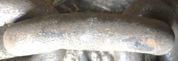 因刮卡、卡阻、撞擊導致鏈條斷裂的主要特征是:斷環多為刮板下平環的頂部,且多為鏈環前進方向反向的頂部斷裂,如圖例所示。