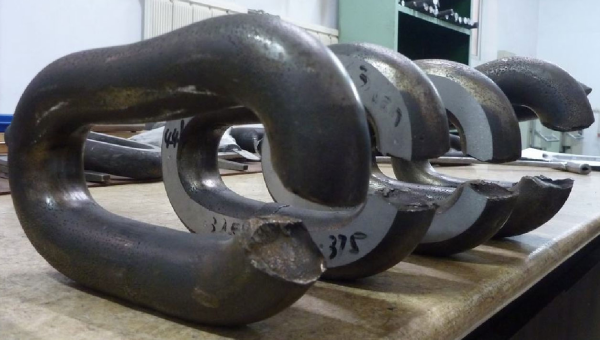 對評估合格后的鏈條進行目視檢查,切除帶有嚴重損傷的鏈環。目視檢查后再進行無損探傷(磁粉探傷或著色探傷)檢測裂紋,切除帶有裂紋的鏈環,用接鏈環替換切除的鏈環,或返回制造廠修配。