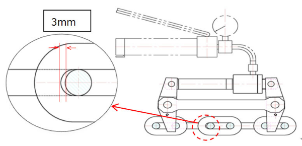 a.將預緊力測試儀放在三個鏈環上,操作手動泵,直到鏈環間空隙達到3毫米,如下圖所示。
