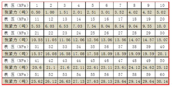 b. 此時從壓力表讀出壓力值,查閱下面的壓力值與噸位對照表即可得到鏈條預緊力噸位: