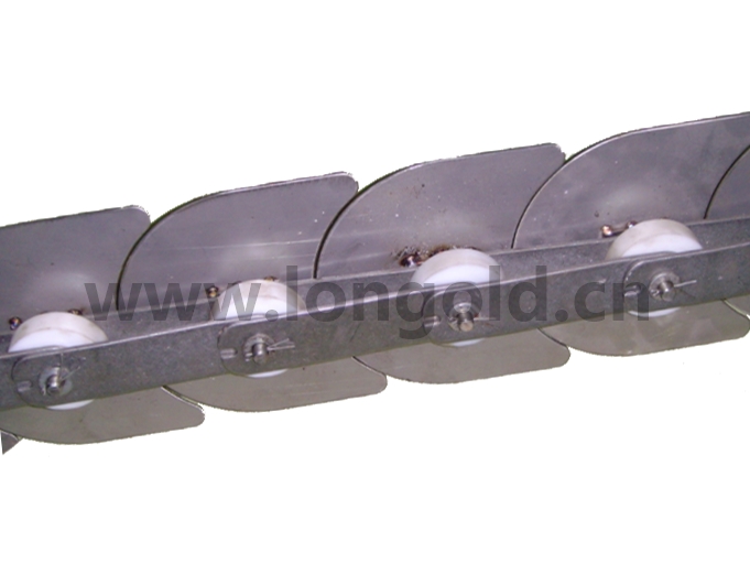 本體鏈條為雙節距帶大滾子輸送鏈條,鏈條上附月牙形狀的附件。主要做水平面的循環輸送用。在回轉壽司等輸送場合有這個廣泛的應用。產品結構簡單,安裝替換方便,更換維護成本低。