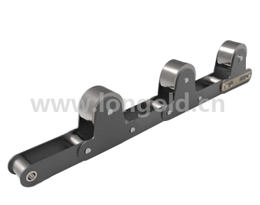將雙倍節距鏈條的鏈板延伸至上部,然后安裝自行旋轉的頂置滾子鏈條。鏈條的本體為免加油鏈條,頂置滾子可選擇鋼制或者工程塑料制滾子。
