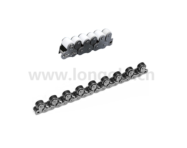 短節距滾子鏈條的鏈板延伸至上部,然后安裝自行旋轉的頂置滾子的鏈條。鏈條本體為不銹鋼制,具有耐腐蝕性。頂置滾子可選用不銹鋼制滾子和工程塑料滾子。