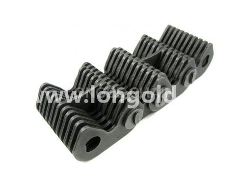 齒形鏈又稱無聲鏈(silent chains),屬于傳動鏈的一種形式。我國的國家標準為:GB/T10855-2003《齒形鏈和鏈輪》。齒形鏈是由一系列的齒鏈板和導板交替裝配用銷軸或組合的鉸接元件連接組成,相鄰節距間為鉸連節。根據導向型式可分為:外導式齒形鏈、內導式齒形鏈和雙內導齒形鏈。