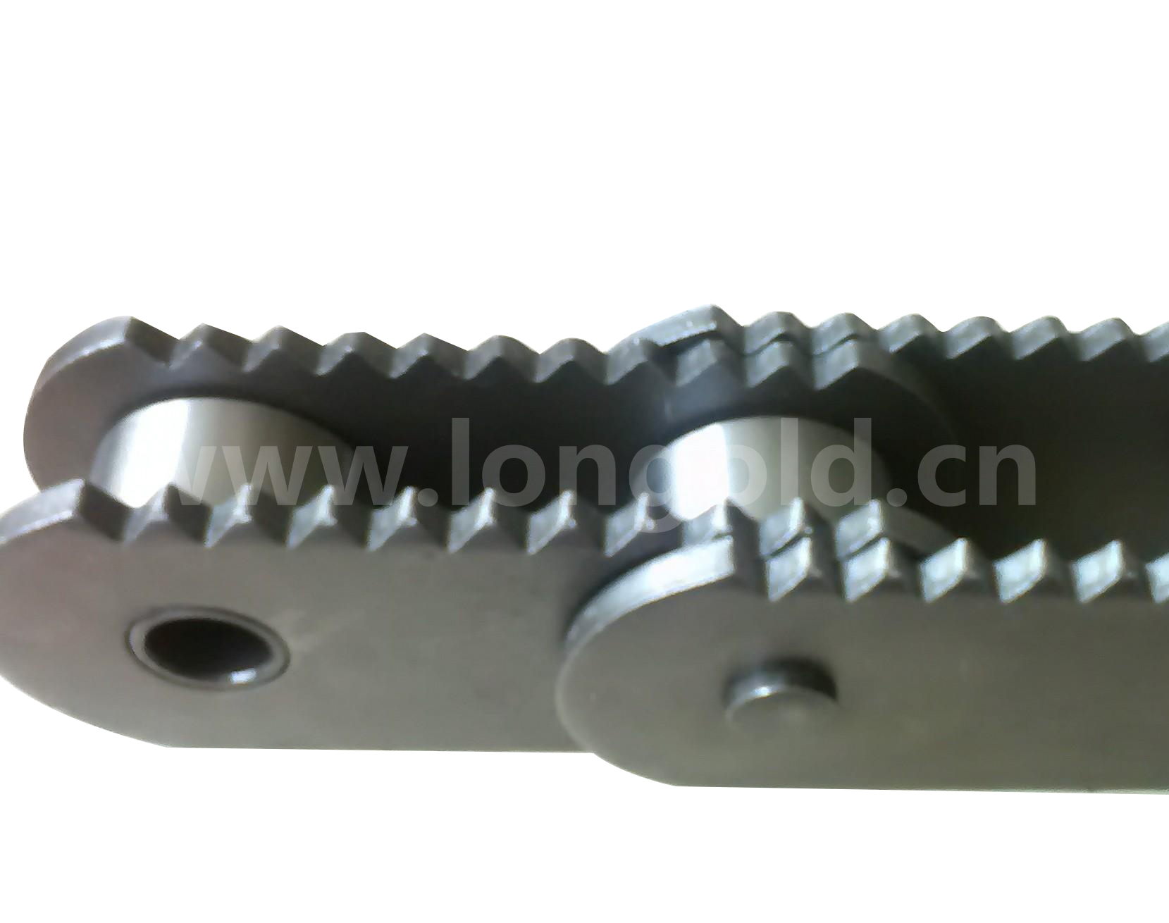 采用標準滾子鏈,并與鏈輪嚙合傳動,鏈板所帶的尖角用于夾持木材輸送,最高傳送速度可達到380m/min,主要應用于木材加工生產線上的精確剖切設備。