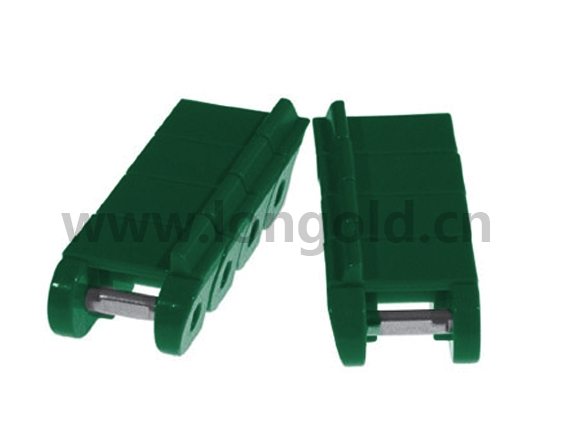 節(jié)距,鏈環(huán)寬度小,適于小件輸送。左右成對使用,適用于帶凸緣容器的輸送。可使用LD40滾子鏈用鏈輪 (13T以上)。根據(jù)鏈輪形狀,輪轂徑有可能需要加工。不生產(chǎn)塑料銷規(guī)格。