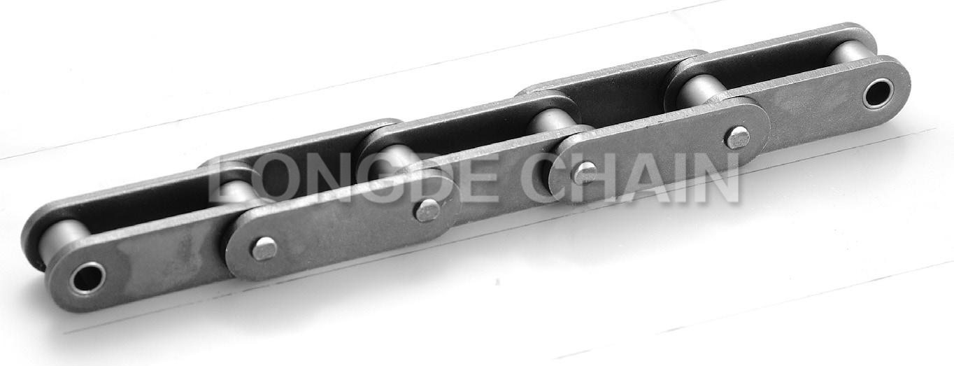 帶附件特殊雙倍節距鏈是把滾子鏈基礎標準GB/T1243-1997《傳動用短節距精密滾子鏈》中所規定的鏈條尺寸,在所有零件的尺寸均保持不變的情況下,只將鏈板孔距增大一倍,從而使鏈條的節距也增大一倍。